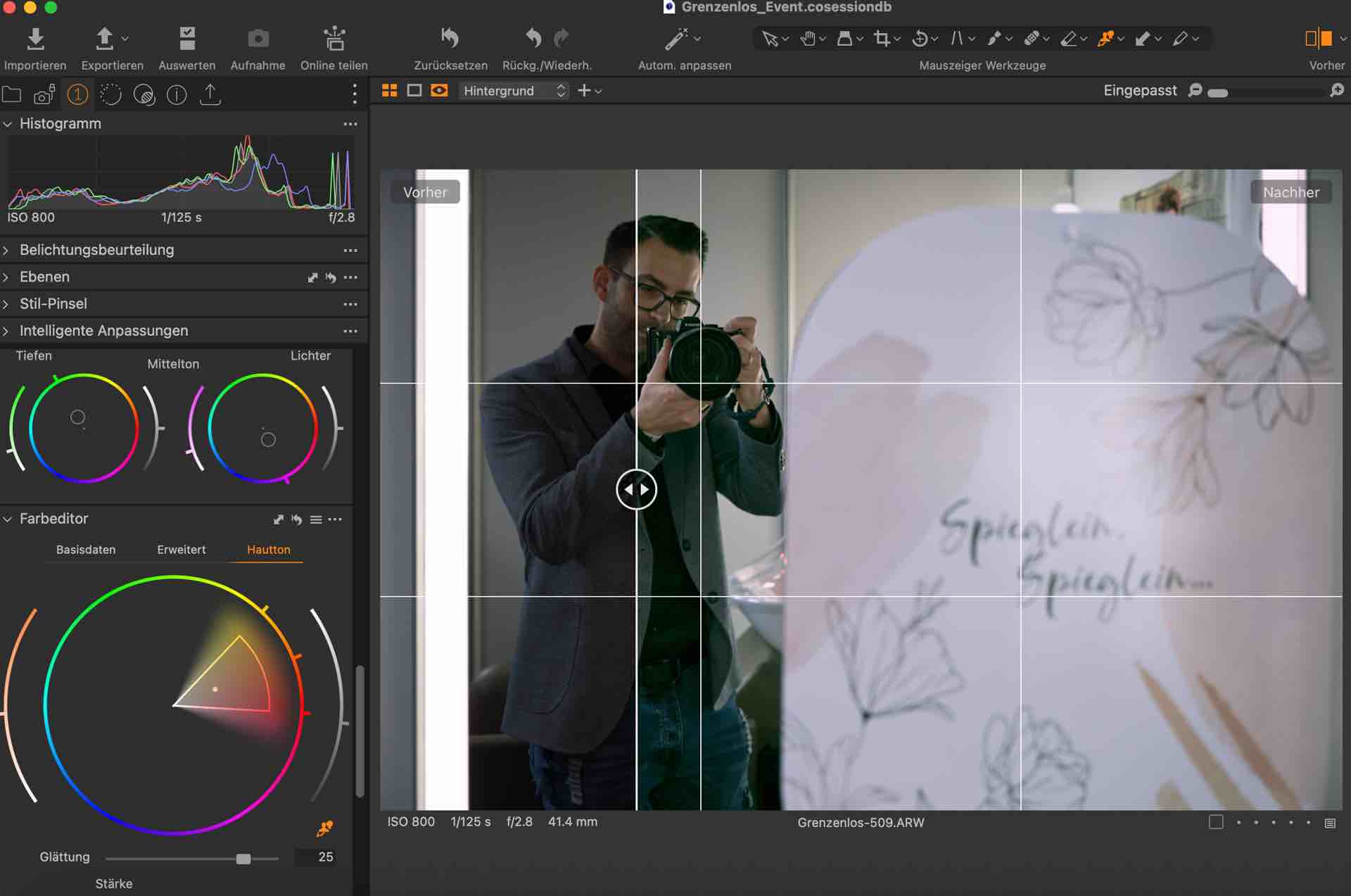 Retusche: Der Fotograf verwendet verschiedene Retusche-Tools, um kleine Fehler im Bild wie Hautunreinheiten oder Augenringe zu korrigieren.
