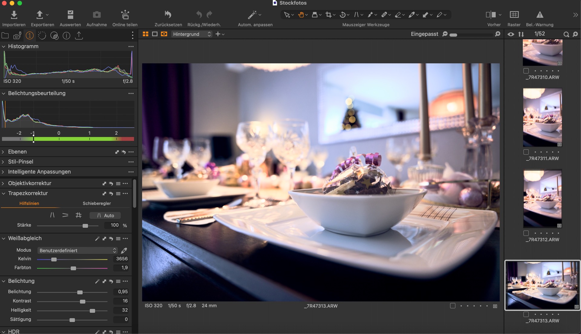 Grundlegende Korrekturen: Der Fotograf passt die Einstellungen wie Belichtung, Kontrast und Farbbalance an, um das Bild so natürlich wie möglich aussehen zu lassen. Somit verbessert man das Grundbild mit kleinen Feinheiten.